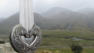 | Gandalfin miekka Glamdring. Taustalla kirjaimellisesti Sumuvuoret. |